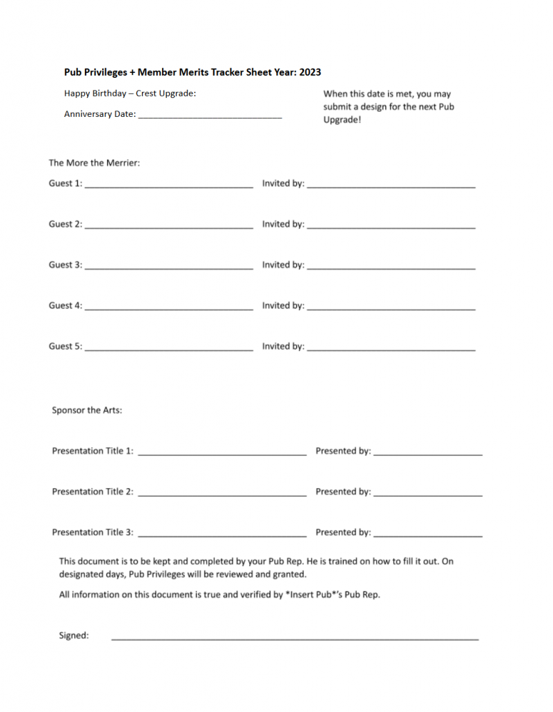 Members earn merits on an individual level. Pubs earn Pub-wide merits collectively. To the right are 2 posters to help explain merits and what’s required to earn them.