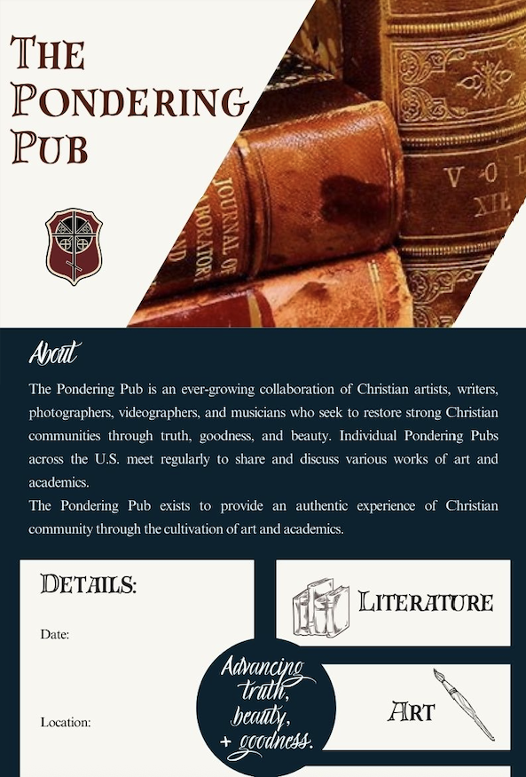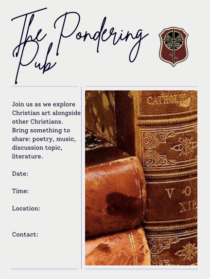 My name is Alexandra, and I’m a parishioner here at 1st Presbyterian. A small group of us are hoping to begin a Christian young adult gathering in the area, focused on conversation, fellowship, and engaging culture thoughtfully through art and discussion. We’re partnering with The Pondering Pub to help guide the format.
