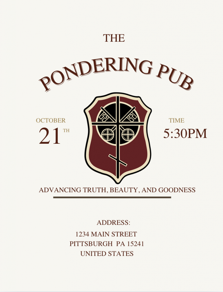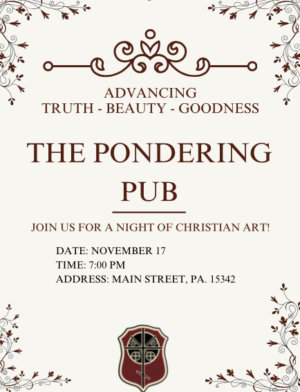 My name is Drew, and I’m a parishioner at St. Mary’s in Bethel Park. Along with a few friends, I’m helping start a local Christian young adult group in the area in partnership with The Pondering Pub. Our goal is to create a space where young adults can engage culture and current events thoughtfully, using art as a way to foster trust, friendship, and deeper conversations about faith.